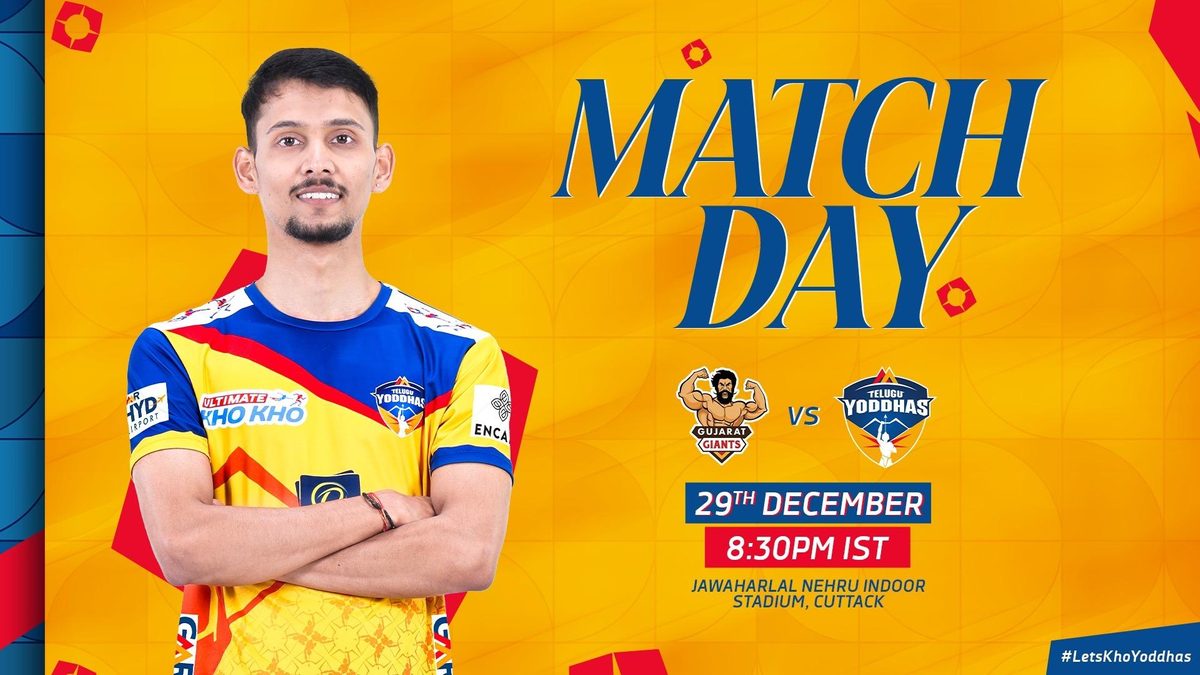 Riding on the back of a solid 38-28 win over Rajasthan Warriors, Telugu Yoddhas, the GMR group-owned franchise, aim to maintain their winning momentum against Gujarat Giants at the Jawaharlal Nehru Indoor Stadium in their Ultimate Kho Kho Season 2 clash.